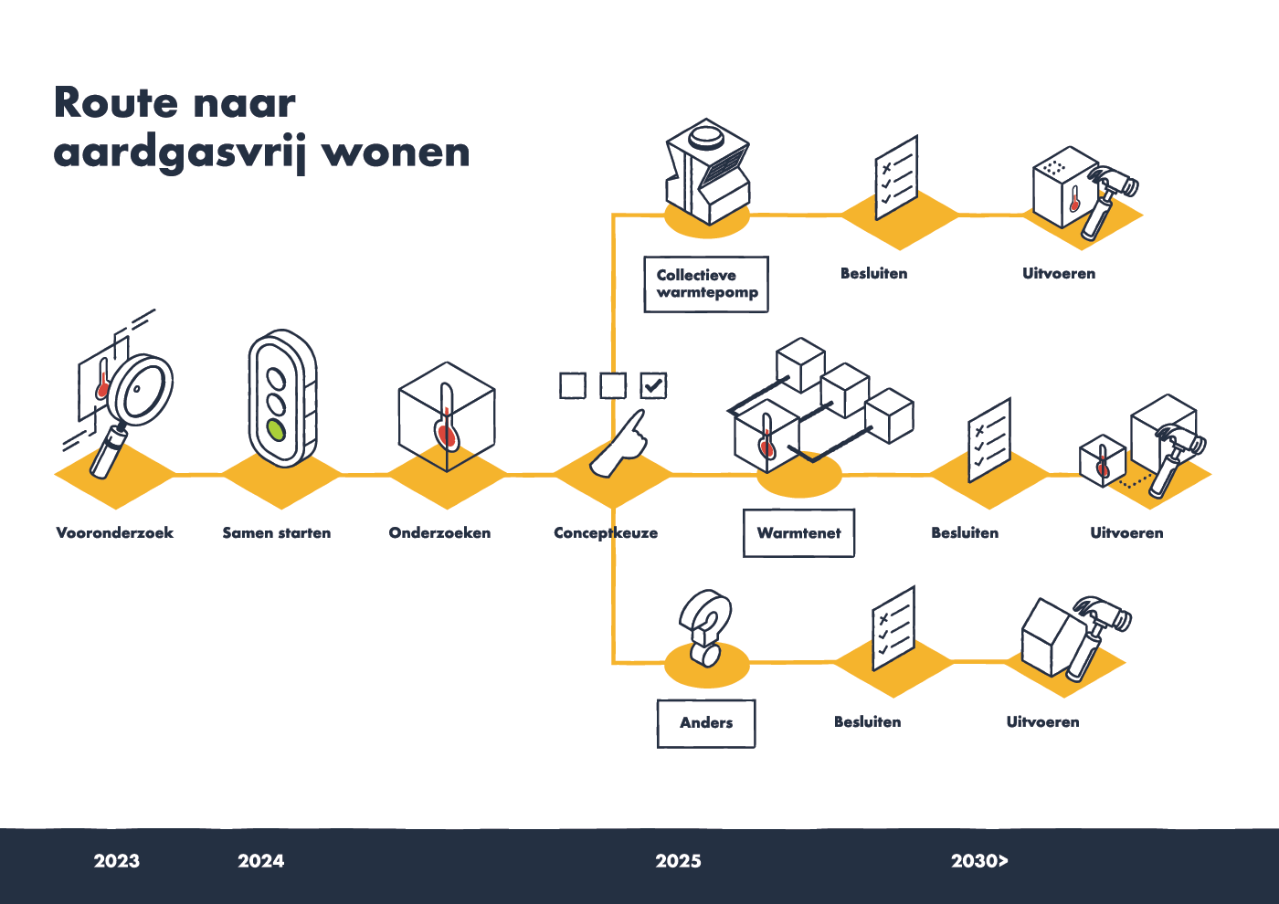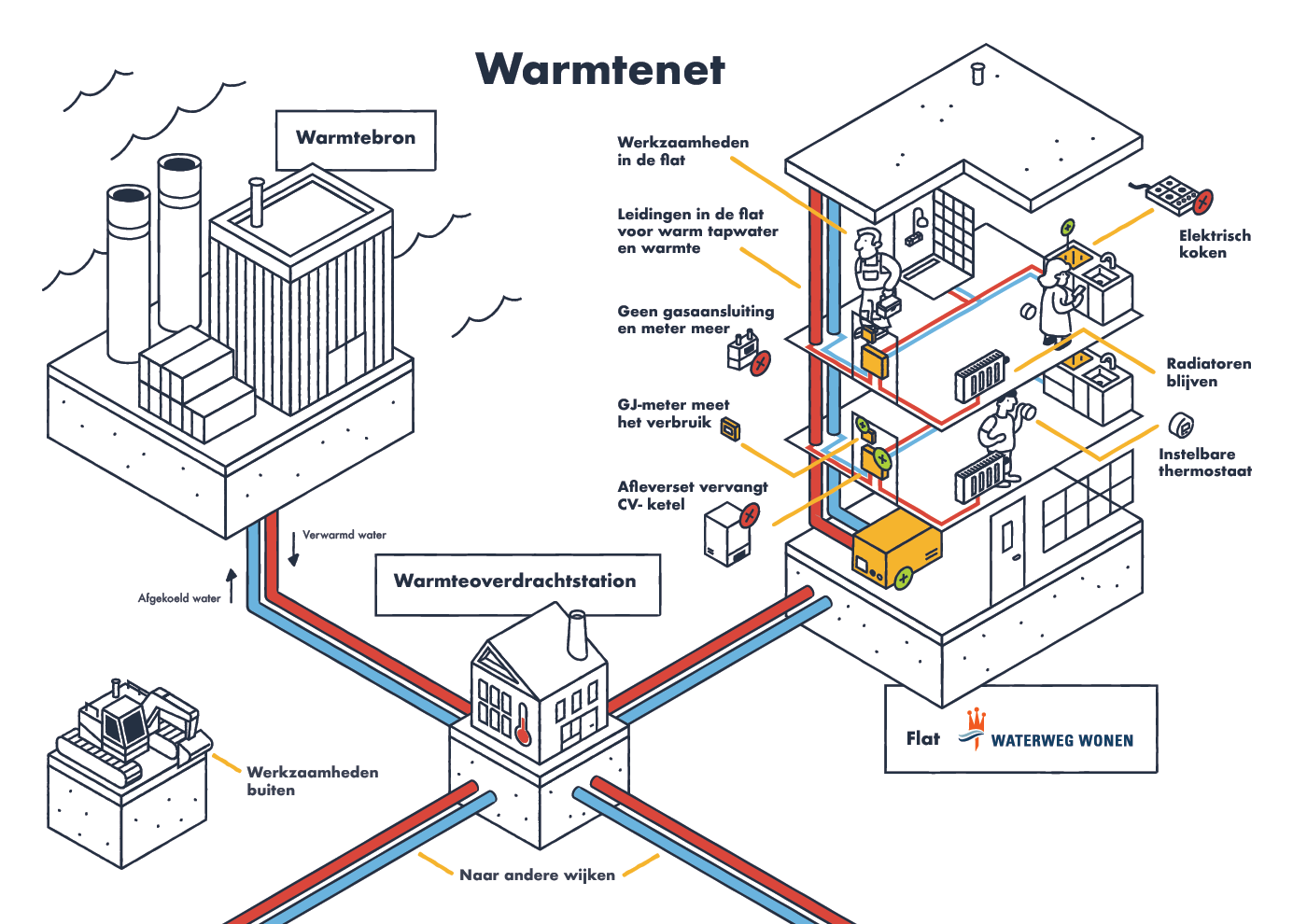 A series of large A0 posters designed for the municipality of Vlaardingen and housing association Waterweg Wonen. The posters show what difference the change to no gas heating makes to their housing situation.
